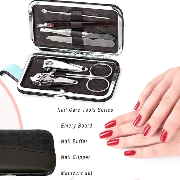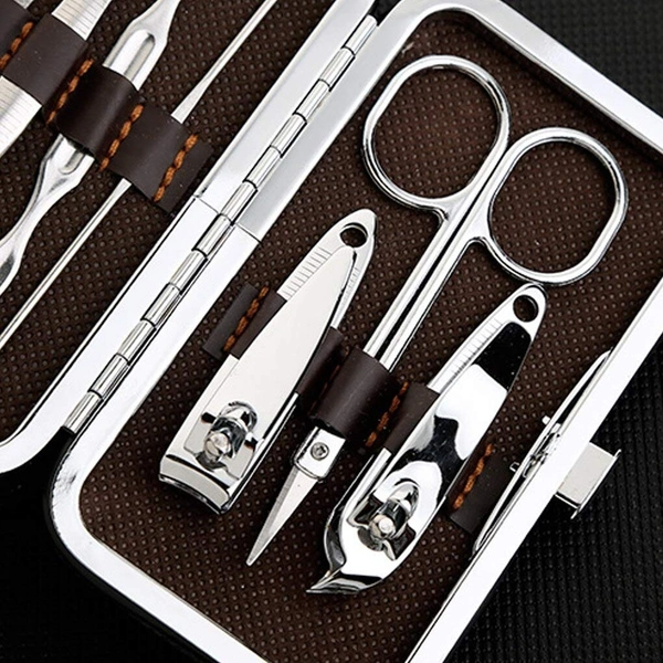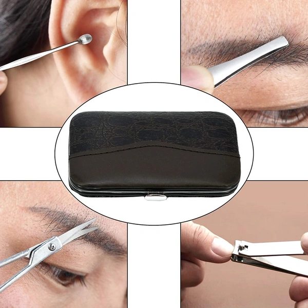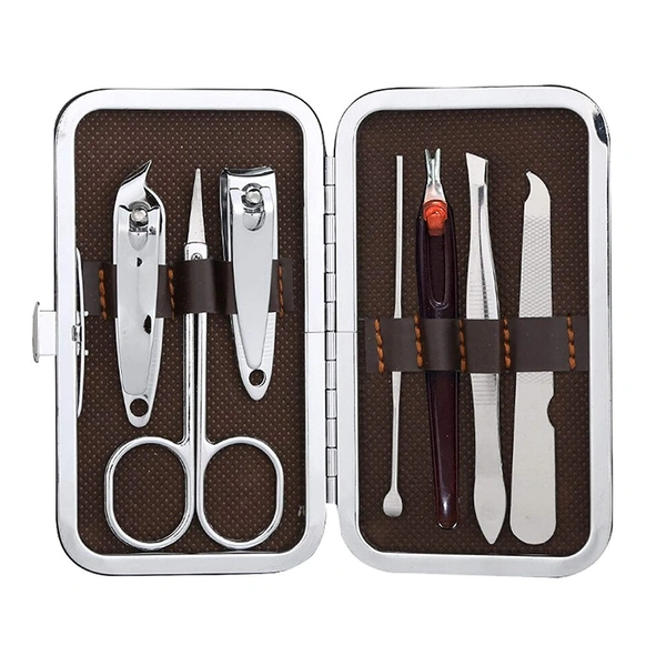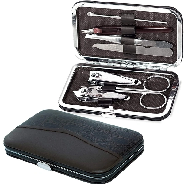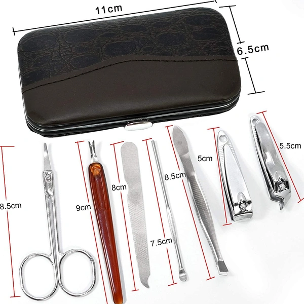 2 Nail Clipper/trimmers, 1 Scissor, 1 Ear Pick, 1 Eyebrow Tweezers,1 Nail File, 1 Singled-edged double Side Stick