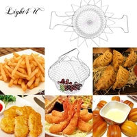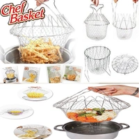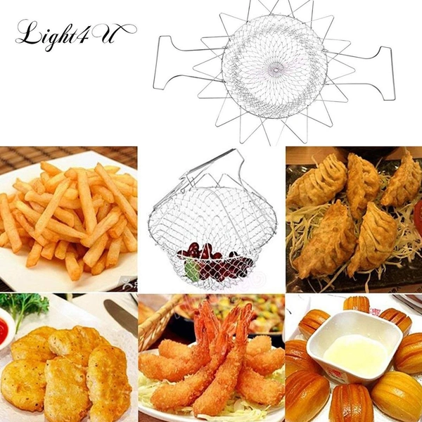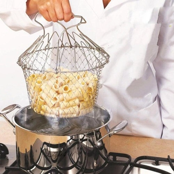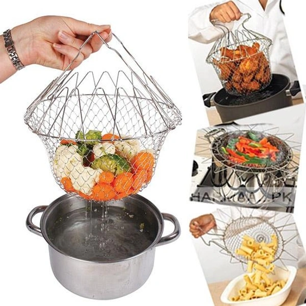 Chef Basket Foldable Cooking Steam Rinse Deep Frying Basket Fry Jali Stainless Steel Fry French Magic Basket Mesh Basket Strainer Net Fried Filter Drainage Rack for Fried Food or Fruits Multifunctional Kitchen Cooking Tool