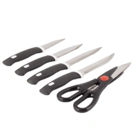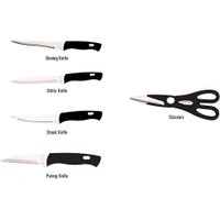 - This amazing knife set comes handy with day to day kitchen job. Made ergonomically in Stainless Steel with Black handles, each of them provide a proper grip.