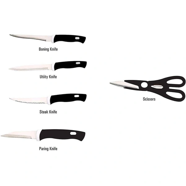 3) This amazing knife set comes handy with day to day kitchen job. Made ergonomically in Stainless Steel with Black handles, each of them provide a proper grip.